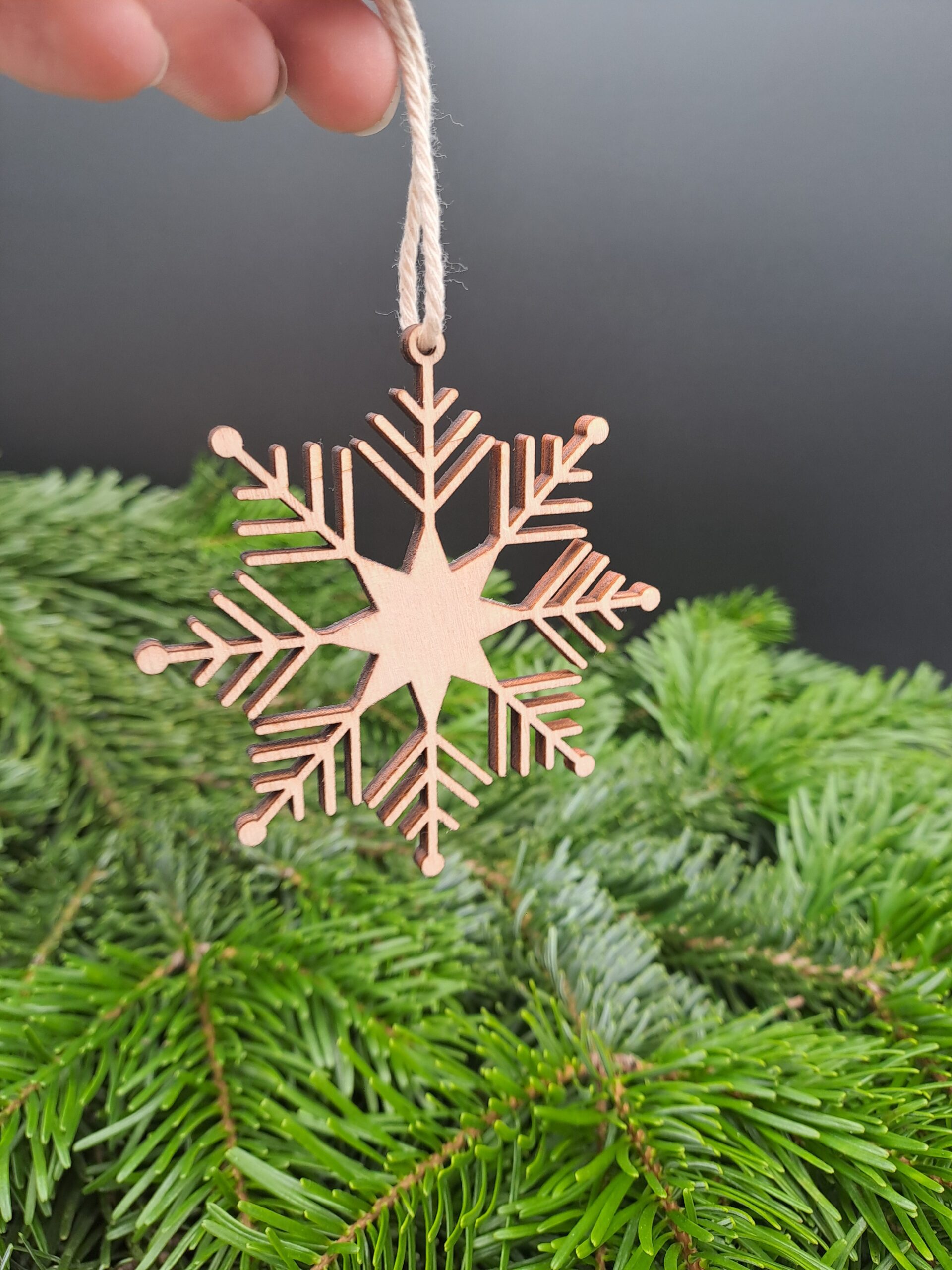 Dieser Tannenbaumschmuck wurde aus Holz aus gelasert und bildet eine Schneeflocke ab, welche oben eine kleine Öse zum aufhängen hat.