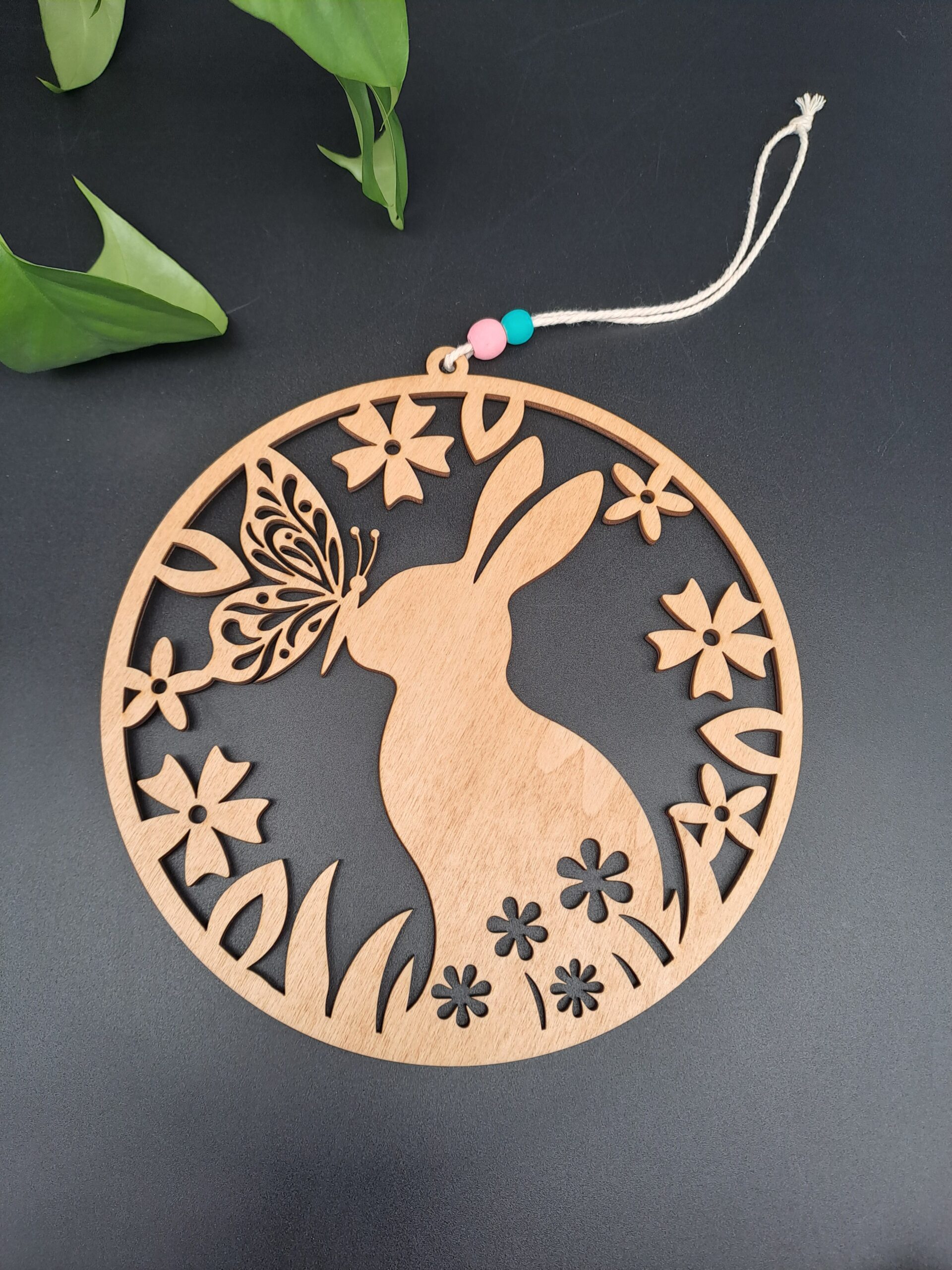 Rundes Holzschild mit Hasen-Motiv & Schmetterling