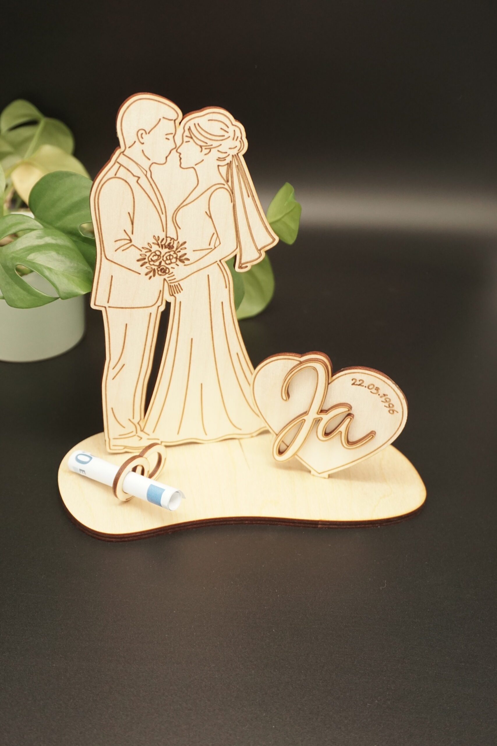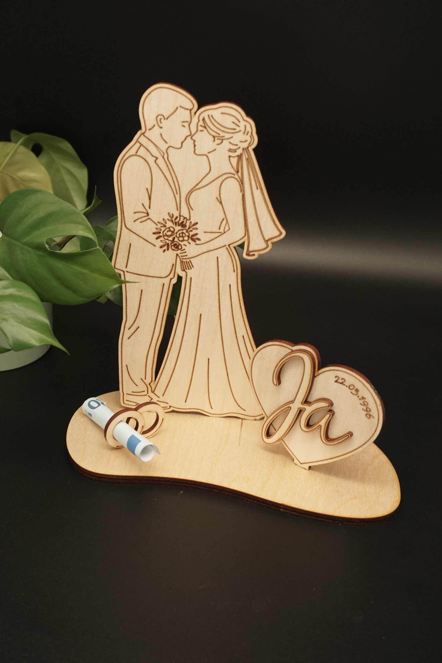 Auf einer stabilen Holzplatte aus 5 mm Birkensperrholz befindet sich auf der linken Seite das Brautpaar, rechts davon ist ein Herz mit „Ja“ Schriftzug und, auf Wunsch, eingraviertem Hochzeitsdatum eingesteckt (das Datum ist natürlich personalisierbar). Vor dem Brautpaar befinden sich zwei ineinander verschlungene Ringe in der Bodenplatte. In diese kannst Du eingerollte Geldscheine, oder kleine Botschaften eingesteckt. 💍💕