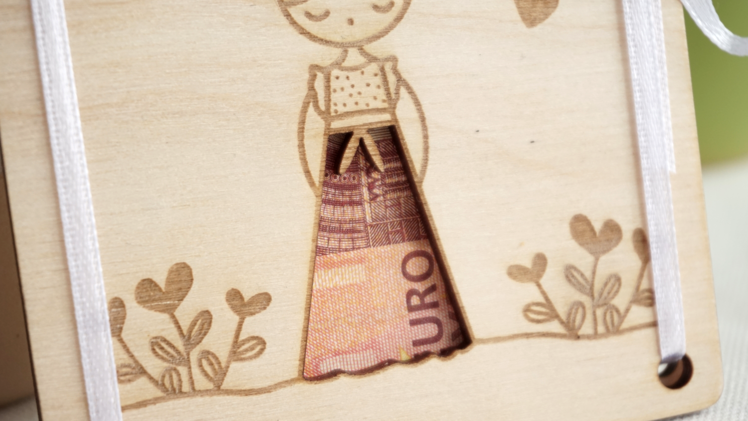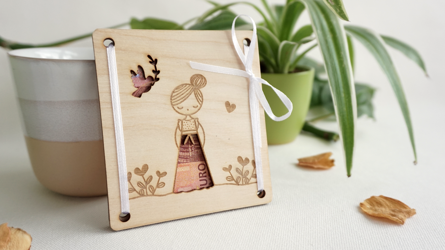 Dieses Geldgeschenk aus Birkenholz bietet eine hochwertige und langlebige Alternative zur klassischen Glückwunschkarte. Das Design zeigt ein graviertes Mädchen-Motiv. Der Rock des Kleides sowie die Silhouette einer Taube dienen als Sichtfenster, durch die der eingelegte Geldschein sichtbar wird. So wird das Geld direkt in das Motiv integriert und ansprechend präsentiert.