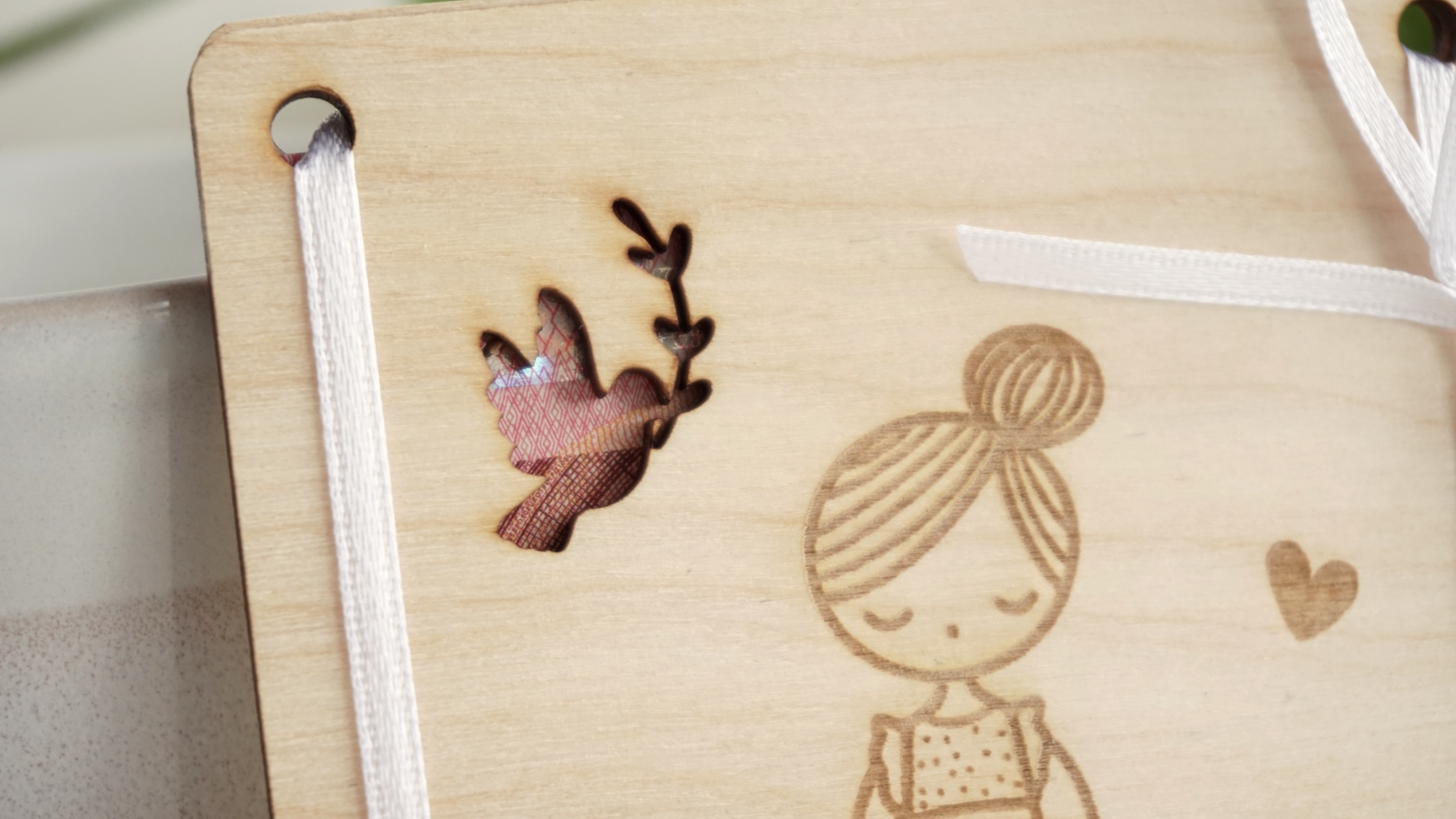 Kreativ & Detailverliebt: Geldgeschenk aus Birkenholz mit zwei Sichtfenstern in Form eines Mädchenkleids und einer Taube. Eine zauberhafte Art, Scheine zur Kommunion stilvoll und natürlich zu überreichen.