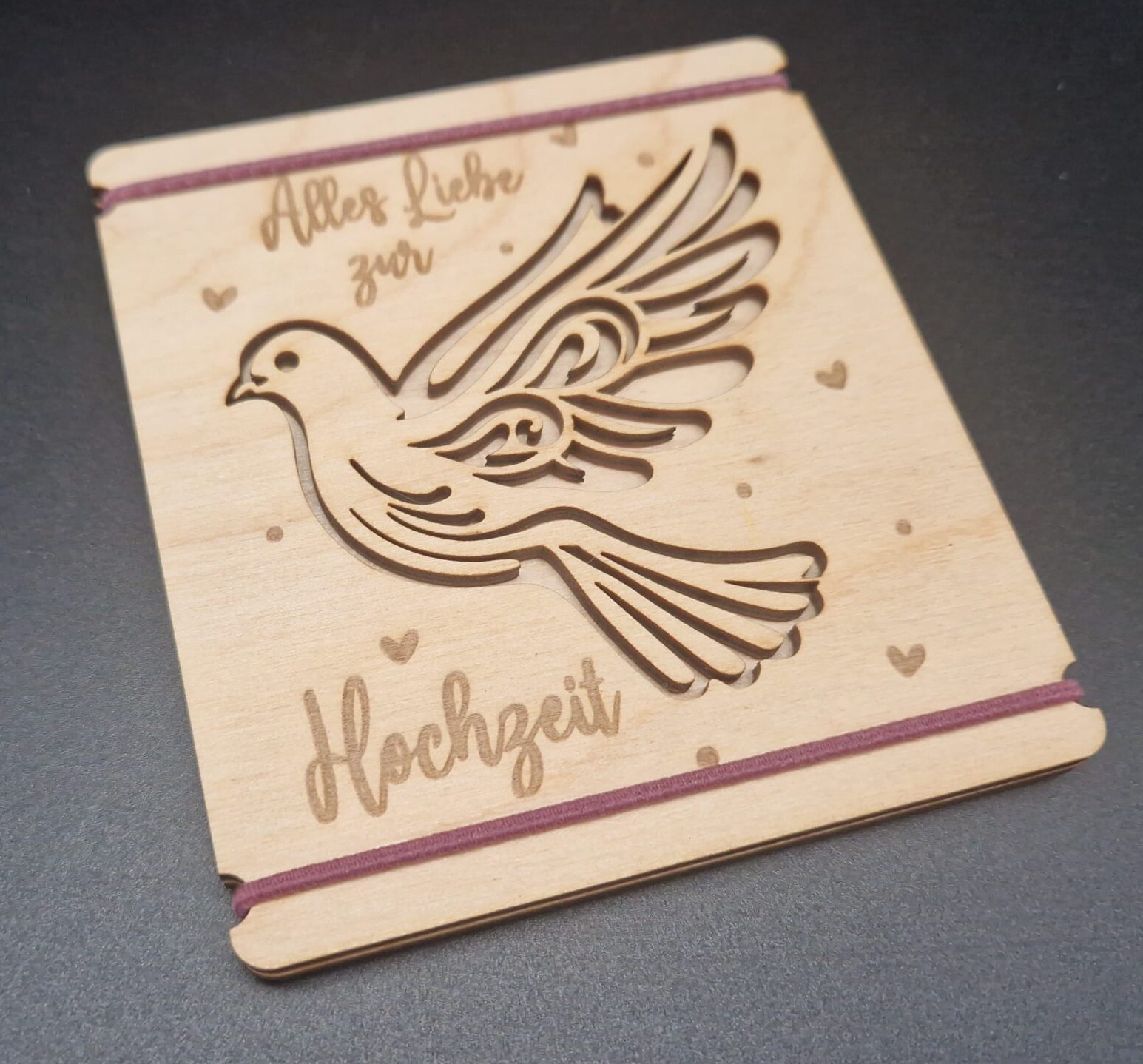 | Stichworte | Geldgeschenk Hochzeit Taube, Hochzeitskarte Holz, Originelle Geldverpackung Hochzeit, Holzkarte mit Gravur, kleine Aufmerksamkeit Hochzeit, Geld verpacken Hochzeit Ideen, Nachhaltige Hochzeitskarte |