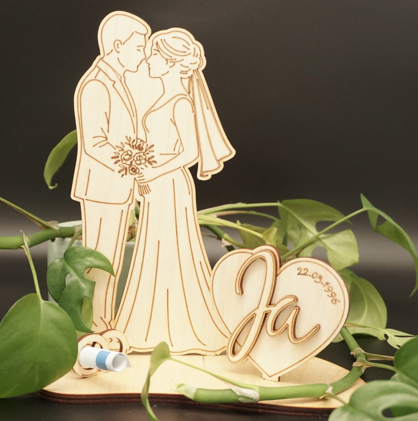 Auf einer stabilen Holzplatte aus 5 mm Birkensperrholz befindet sich auf der linken Seite das Brautpaar, rechts davon ist ein Herz mit „Ja“ Schriftzug und, auf Wunsch, eingraviertem Hochzeitsdatum eingesteckt (das Datum ist natürlich personalisierbar). Vor dem Brautpaar befinden sich zwei ineinander verschlungene Ringe in der Bodenplatte. In diese kannst Du eingerollte Geldscheine, oder kleine Botschaften eingesteckt. 💍💕