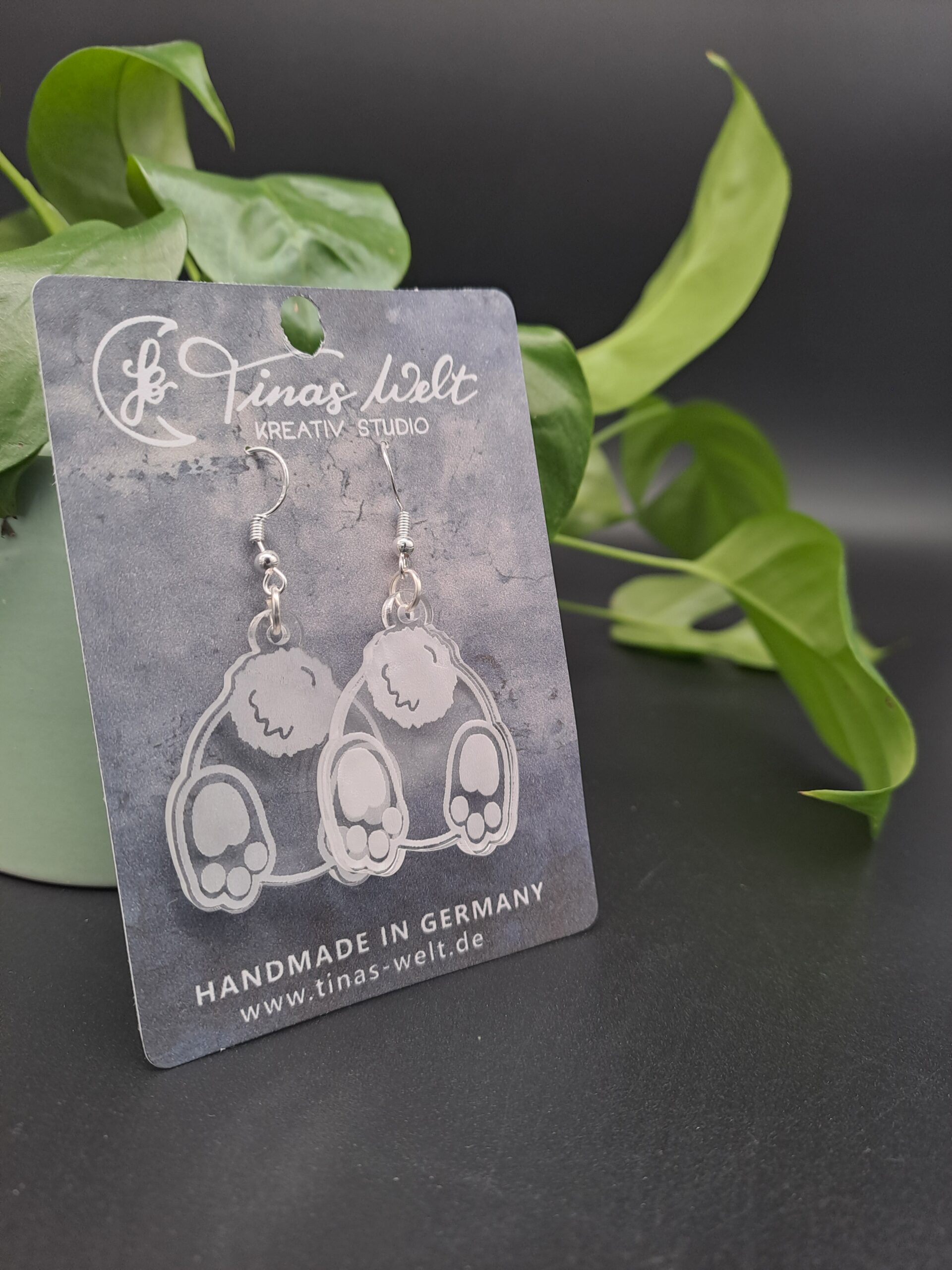 Mit diesen Häschen-Ohrringen zieht der Frühling in deine Schmucksammlung ein. Die Anhänger aus klarem Acryl zeigen die Silhouette eines Hasen von hinten, ergänzt durch die Gravur eines puscheligen Schwänzchens und kleiner Pfoten. Da das Material transparent ist, wirken sie trotz ihrer Größe leicht und passen zu jedem Outfit, ohne aufdringlich zu sein. Ob als kleine Aufmerksamkeit für dich selbst oder als Überraschung für einen lieben Menschen – diese Ohrringe bringen eine Portion Leichtigkeit in den Alltag.