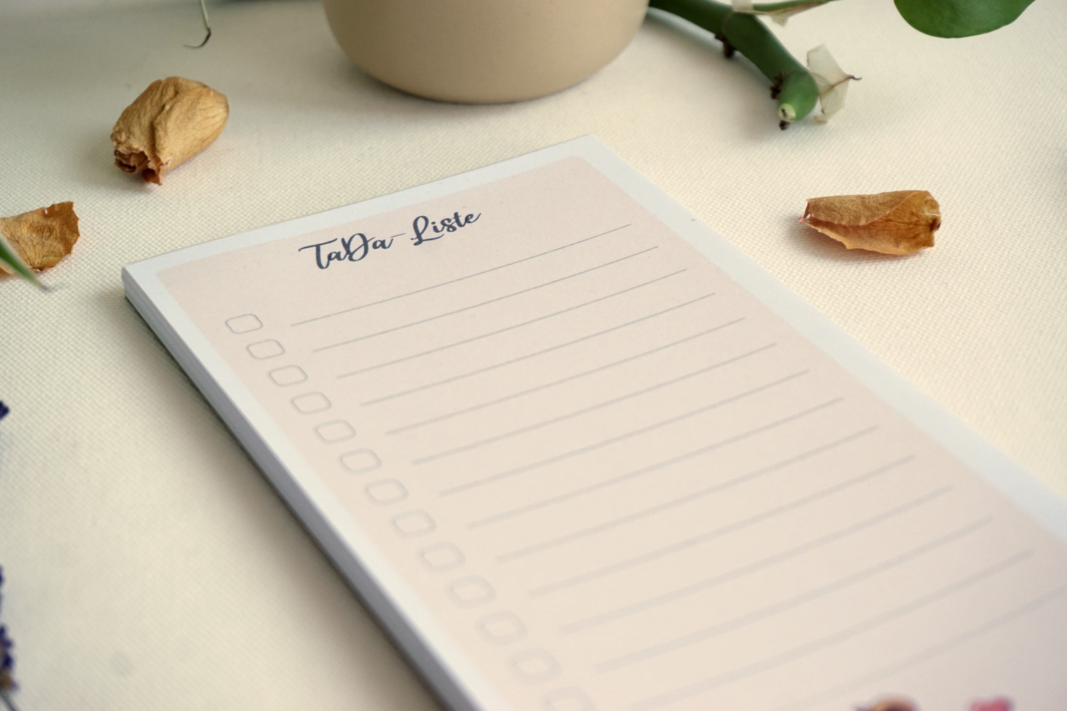 Ideales Format: Mit ca. 22 cm x 11 cm hat die Liste eine elegante, schlanke Form, die perfekt neben deine Tastatur oder in den Planer passt.
